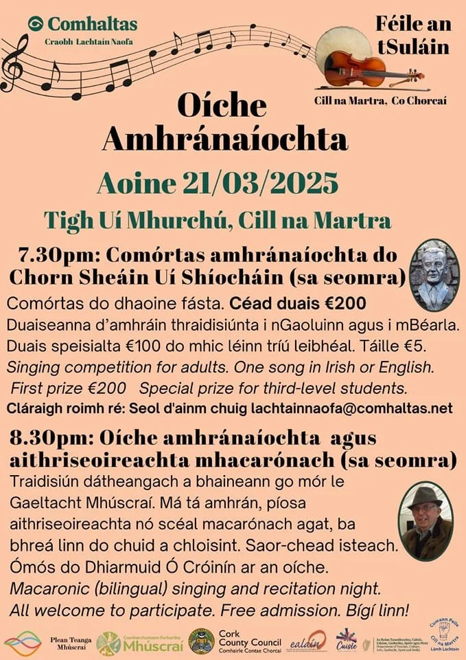 Déan teagmháil linn/ Contact Us!lachtainnaofa@comhaltas.net Lóistín i gCill na Martra/ Accommodation in Cill na MartraGlaoigh/ Call 086 400 9664 Príomh Imeachtaí/ Main Events
